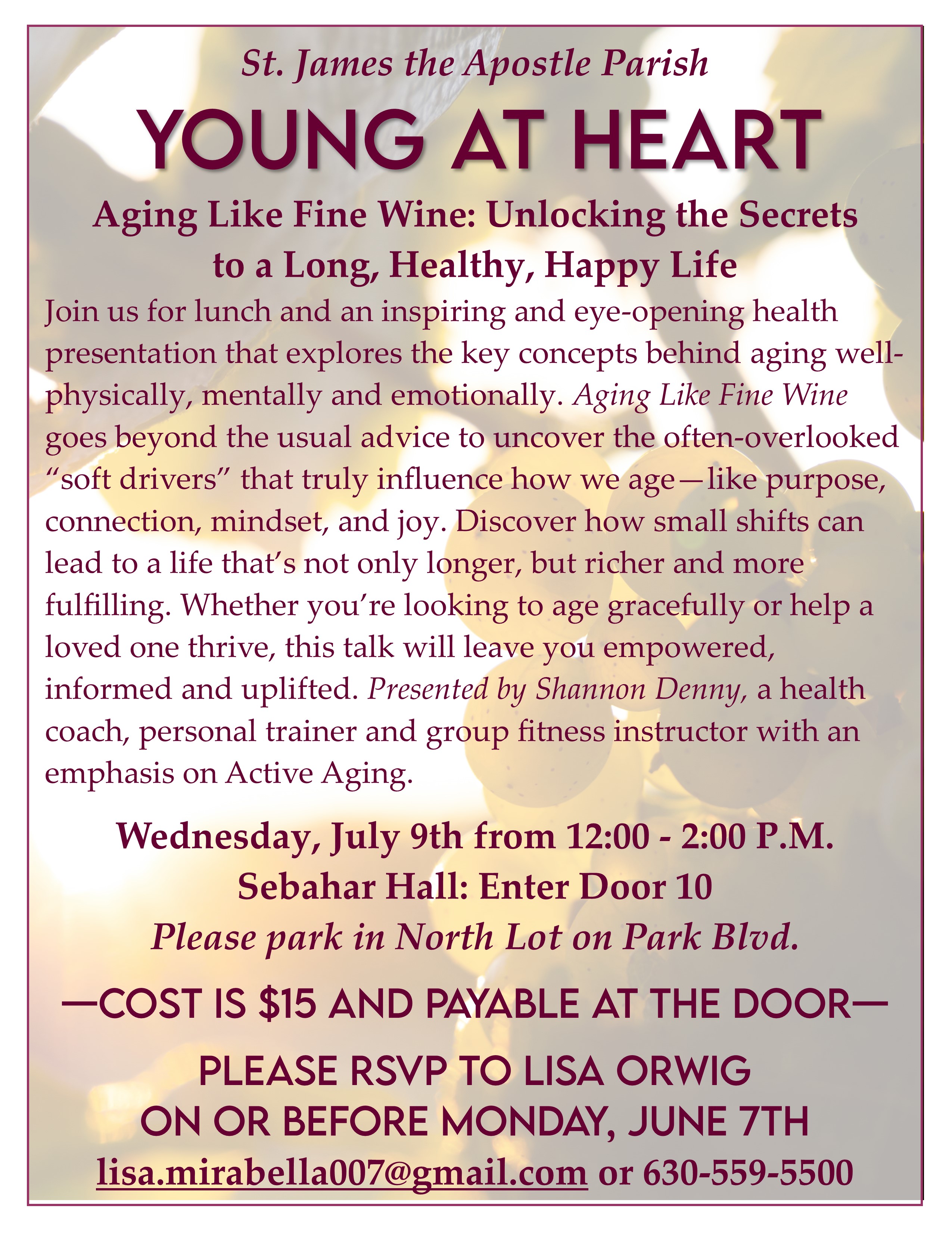 Join us for lunch and an inspiring and eye-opening health presentation that explores the key concepts behind aging well-physically, mentally and emotionally. Aging Like Fine Wine goes beyond the usual advice to uncover the often-overlooked “soft drivers” that truly influence how we age—like purpose, connection, mindset, and joy. Discover how small shifts can lead to a life that’s not only longer, but richer and more fulfilling. Whether you’re looking to age gracefully or help a loved one thrive, this talk will leave you empowered, informed and uplifted. Presented by Shannon Denny, a health coach, personal trainer and group fitness instructor with an emphasis on Active Aging.