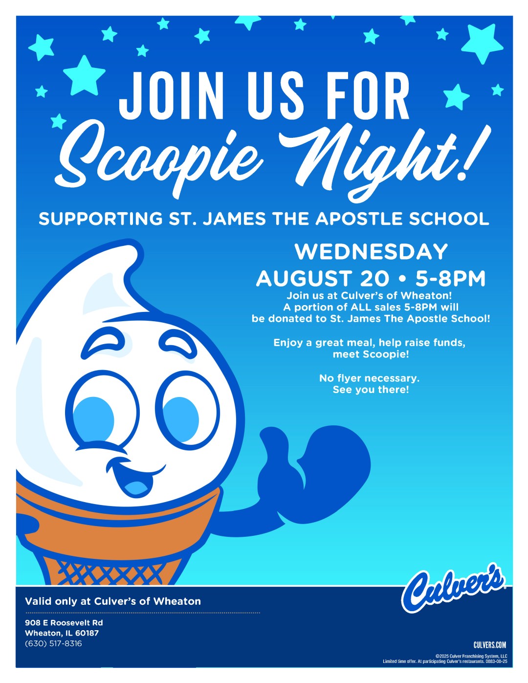 Fundraiser for St. James School at Culver’s in Wheaton Tonight, August 20th from 5-8 P.M.