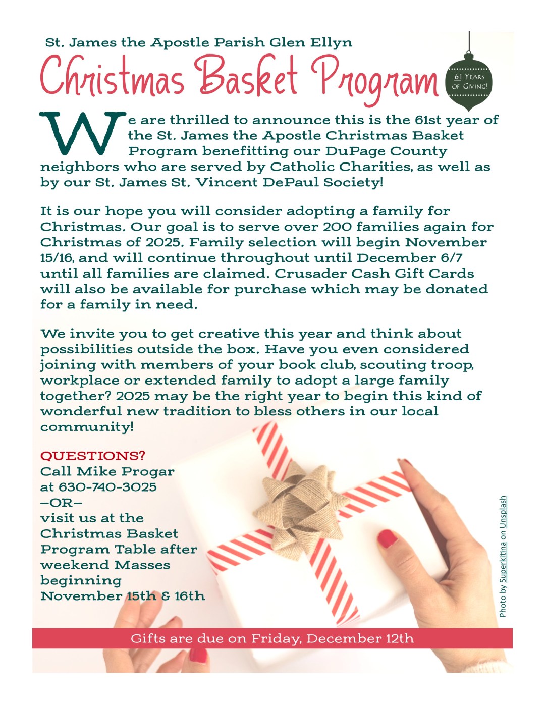 We are thrilled to announce this is the 61st year of the St. James the Apostle Christmas Basket Program benefitting our DuPage County neighbors who are served by Catholic Charities, as well as by our St. James St. Vincent DePaul Society!