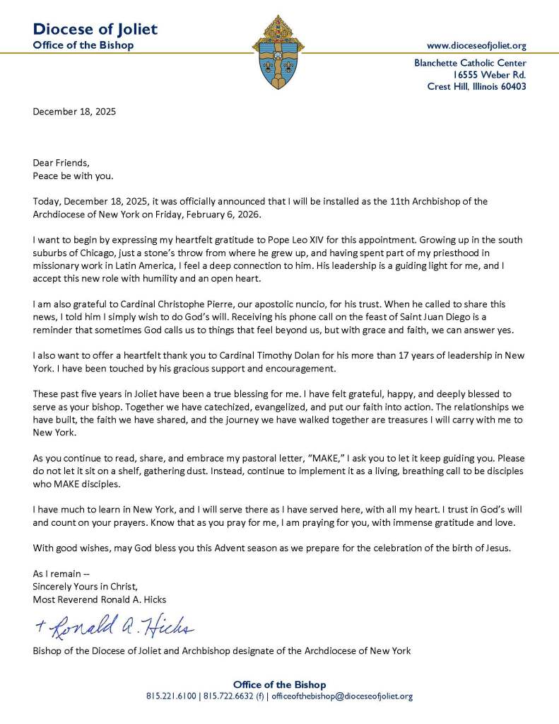 We invite all parishioners to continue to pray for Archbishop Designate Bishop Hicks in the upcoming weeks.