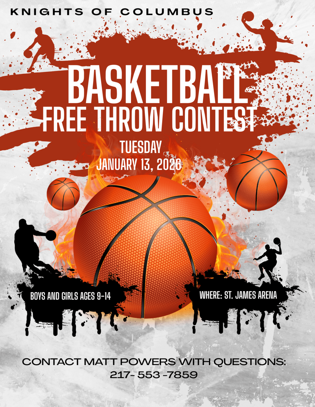 On Tuesday, January 13th at 7pm, the St. James Knights of Columbus will be hosting a Free Throw Contest at St. James the Apostle Gym.