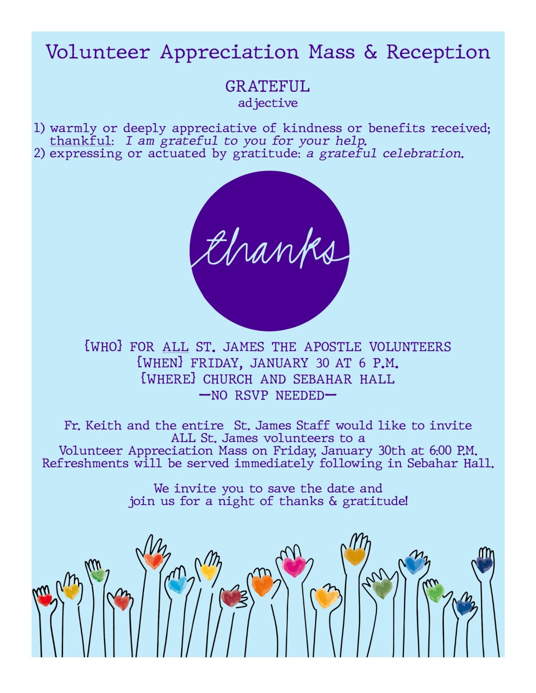 Fr. Keith and the entire St. James Staff would like to invite ALL St. James volunteers to a Volunteer Appreciation Mass on Friday, January 30th at 6:00 P.M. Refreshments will be served immediately following in Sebahar Hall.