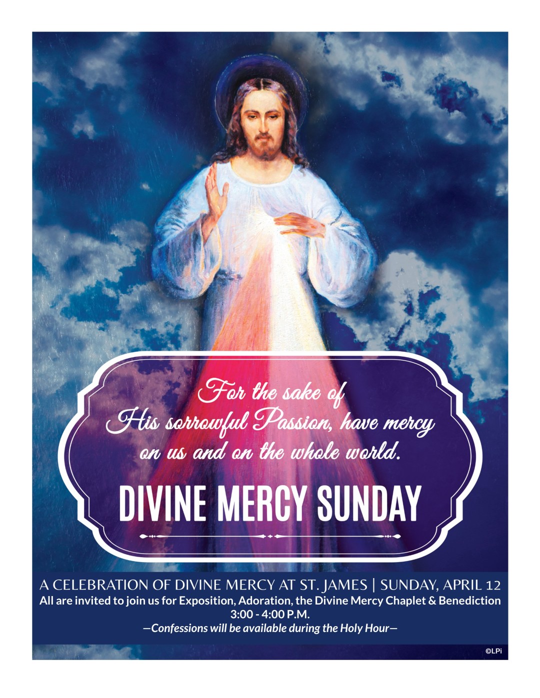 Join us for a Celebration of Divine Mercy on Sunday, April 12, in the church. All are invited to Exposition, Adoration, and the Divine Mercy Chaplet & Benediction from 3:00 – 4:00 P.M. Confessions will be available during the Holy Hour.