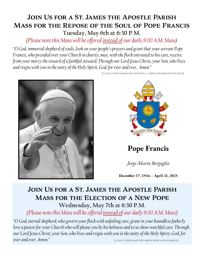 Please join us for our special Masses on Tuesday, May 6th and Wednesday, May 7th. The first will be a Memorial Mass for the Repose of the Soul of Pope Francis. The second will be for the election of our new pope. Both Masses will be offered at 6:30 P.M. and will be in lieu of our regularly scheduled 8 A.M. Daily Mass.